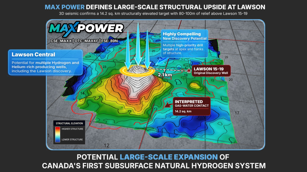 MAX Power Mining (CSE: MAXX; OTC: MAXXF; FRANKFURT: 89N) announced it has retained GLJ Ltd., a Calgary-based energy consulting firm, to support commercial evaluation of the Lawson Natural Hydrogen system in Saskatchewan following 3D seismic results that significantly expanded the project’s interpreted scale. GLJ will focus on resource modeling, development potential and optimization of an expanded drill program targeting Natural Hydrogen and Helium across the 28 sq. km Lawson Complex, while also contributing to development of the Company’s AI-driven MAXX LEMI platform.