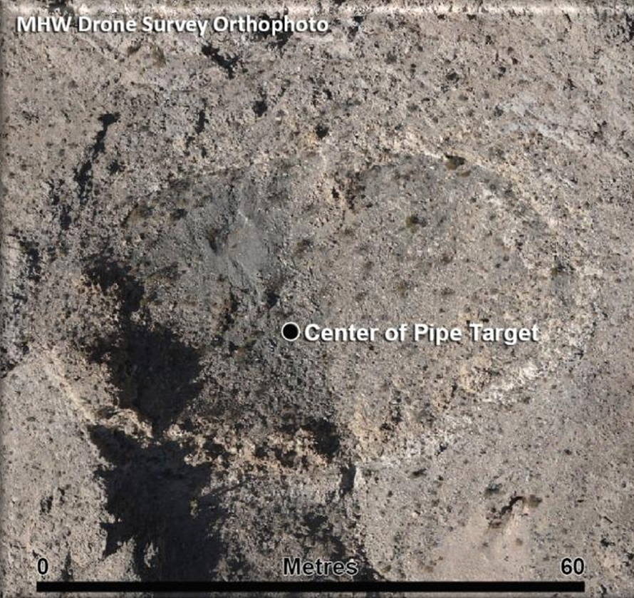 The Pipe Target (#7), stands out as a compact, steeply oriented body based on independent 3D modeling of the magnetic data. (See Pipe Target Mag) [1] The pipe-shaped geological feature mapped in the field is directly aligned with the modeled underground magnetic signature at the Pipe Target. (See Map Overlay)