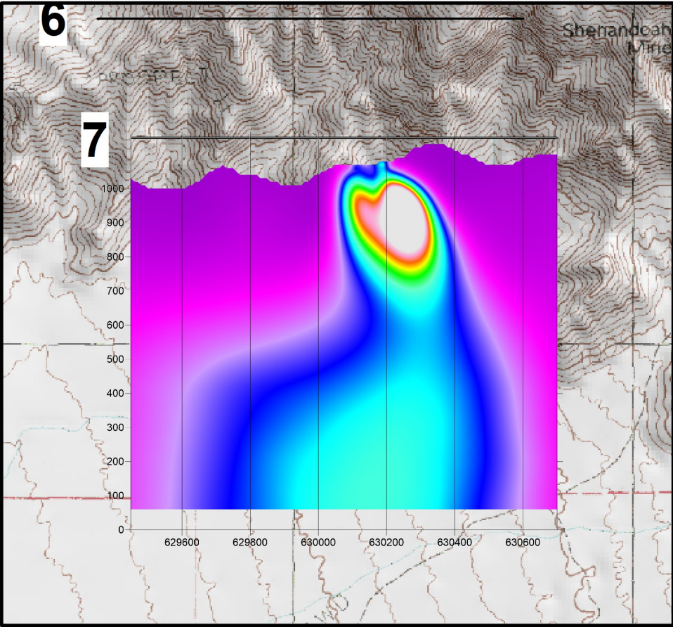- MVI 3D modeling of the magnetic data identified 8 distinct underground magnetic bodies. (Wright Geophysics) See 3D Model of Underground Anomalies: MVI Amplitude Iso-surfaces with Topography Viewed from Below to Northeast [1]